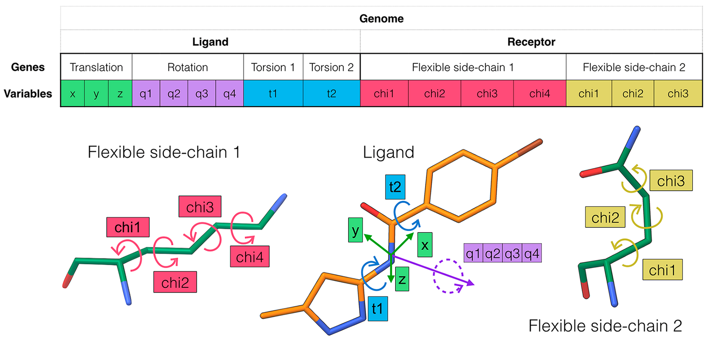 The ligand and receptor flexibility description is first used to assemble a list of variables (genome).