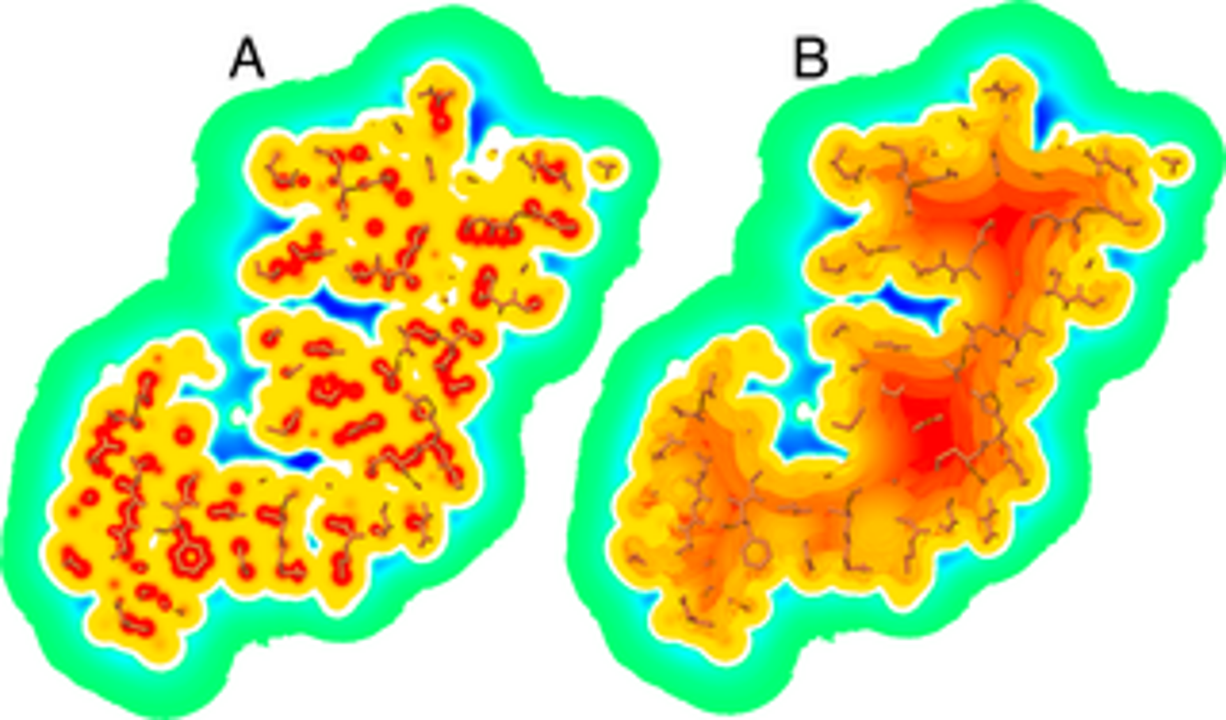 The color gradient outside the protein surface indicates favorable interactions going from weak (green) to strong (blue). Inside the protein surface the color gradient indicates unfavorable interactions going from low (yellow) to highly unfavorable (red).