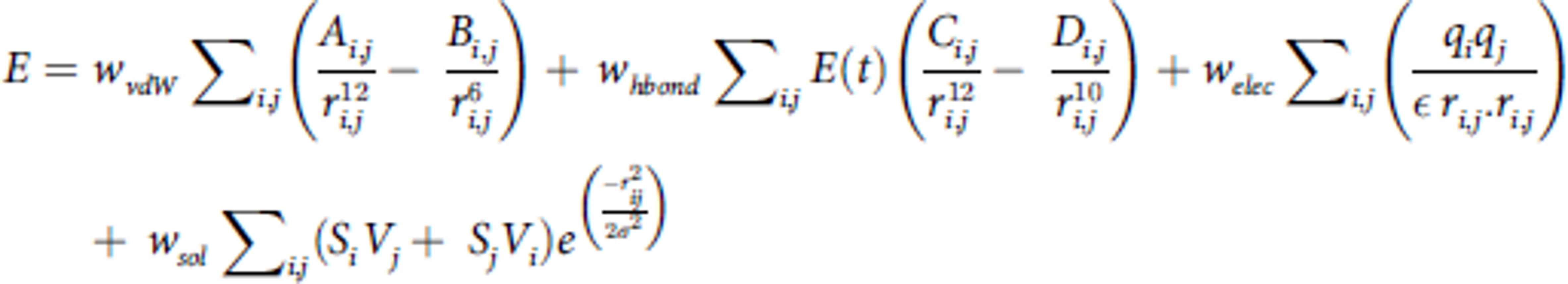 \[ E = w_{vdW}\sum_{i,j}\biggl(\frac{A_{i,j}}{r_{i,j}^{12}} - \frac{B_{i,j}}{r_{i,j}^6}\biggr) + w_{hbond}\sum_{i,j}E(t)\biggl(\frac{C_{i,j}}{r_{i,j}^{12}} - \frac{D_{i,j}}{r_{i,j}^{10}}\biggr) + w_{elec}\sum_{i,j}\biggl(\frac{q_iq_j}{\epsilon \space r_{i,j}.r_{i,j}}\biggr) \\ + w_{sol}\sum_{i,j}(S_iV_j + S_jV_i)e^{\bigl(\frac{-r_{ij}^2}{2\sigma^2}\bigr)} \]